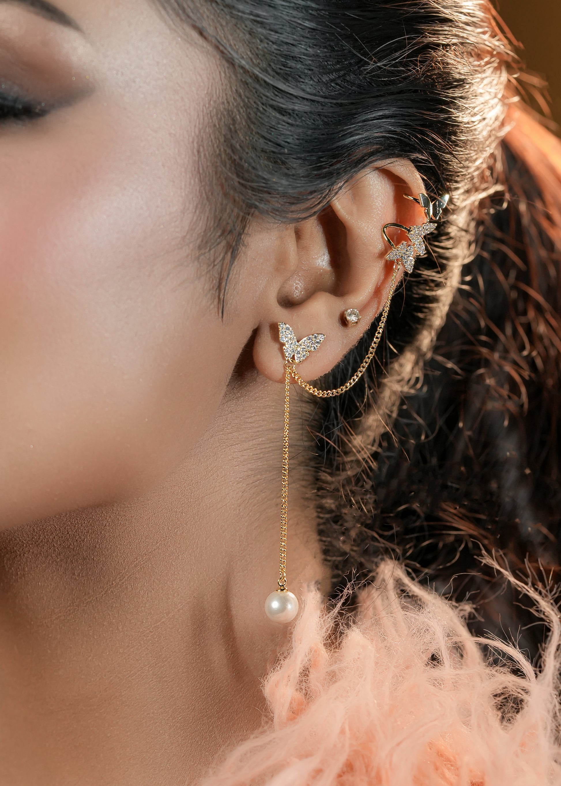 Spread your wings with this enchanting golden butterfly ear cuff, perfectly sized for your left ear! This playful accessory features an adjustable design that molds to your comfort, so it stays put through all your adventures. The anti-tarnish coating keeps your cuff looking radiant and lustrous, while the delicate pearl hanging adds a touch of timeless elegance. Lightweight and effortlessly chic, it's the perfect way to add a sprinkle of magic to your everyday style.