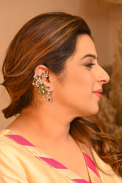 Elevate your ear game with these stunning multi-coloured Kaanphool that refuse to pick a side! Crafted with 18k gold plating and feather-light construction, they're your new best friend whether you're rocking a traditional saree or mixing it up with indo-western vibes. The adjustable design ensures a perfect fit every time, so you can focus on turning heads instead of adjusting jewelry. Versatile, gorgeous, and practically weightless—what's not to love?